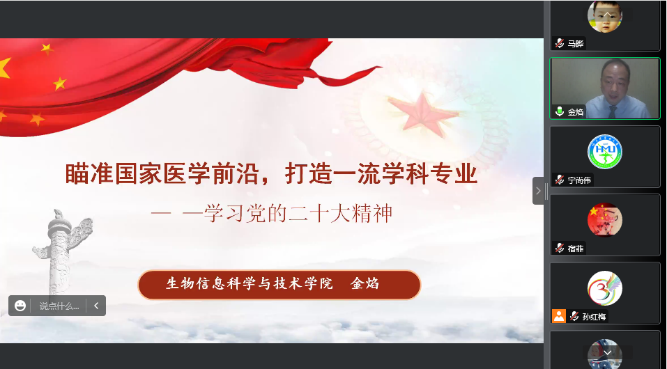 党委书记金焰同志以《瞄准国家医学前沿 打造一流学科专业》为题,做党的二十大精神首场宣讲报告。金焰从党的二十大会议基本情况、党的二十大报告学习、以党的二十大精神为引领,落实学校工作部署,推动学院高质量发展三个方面做了系统宣讲和深刻阐释,特别是对党的二十大报告中提到的教育、科技和人才建设等重点内容结合学院实际工作进行详细阐释。在对学院未来的建设发展上,金焰从四个方面进行详细部署:一是夯实基础,加快推动教学质量发展。二是优化资源配置,完善科技创新体系建设。三是引入并举,深入实施人才强院战略。四是党建引领,推动支部工作于学院发展有机统一。