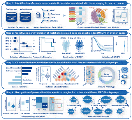 卵巢癌作为“妇癌之王”,多数患者初次诊断已为临床晚期,缺乏有效预测卵巢癌患者生存期和治疗反应的标志物。代谢重编程是肿瘤细胞通过改变能量代谢以适应酸性、缺乏营养和低氧微环境而快速生长的现象。已有研究表明卵巢癌的发生与能量代谢途径有关,如半乳糖的摄入和代谢是卵巢癌的风险因素。课题组开发了代谢基因预后指数模型MRGPI,可用于预测卵巢癌患者预后、免疫治疗反应和候选药物。该研究提高了对代谢相关基因、肿瘤分期、预后能力和肿瘤免疫微环境之间关系的认识,为卵巢癌患者分层管理和治疗策略定制提供更多的视角。研究论文“Metabolic-Related Gene Prognostic Index for Predicting Prognosis,Immunotherapy Response, and Candidate Drugs in Ovarian Cancer”发表在2024年1月的《Journal of Chemical Information and Modeling》杂志上(IF:5.6),2018级本科生刘玉伟为并列第一作者,宁尚伟教授为通讯作者。