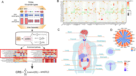 昼夜节律调节着生物体内复杂的生理活动,昼夜节律失调与癌症之间的存在密切联系。课题组对18种癌症的48个昼夜节律基因(CRGs)的转录组和基因组进行分析,发现癌症中昼夜节律基因(包含13个时钟控制基因和35个核心时钟基因)普遍存在异常表达。课题组通过对癌症中昼夜节律基因的转录组和基因组进行分析并构建了昼夜节律评分模型CRS,该模型得分可以作为一个临床指标用来预测患者的预后和对治疗的反应,并识别潜在的"时钟药物",用于癌症的辅助治疗。研究论文“CRS: a circadian rhythm score model for predicting prognosis and treatment response in cancer patients”发表在2023年3月的《Journal of Translational Medicine》杂志上(IF:7.4),2018级本科生刘玉伟为第一作者,宁尚伟教授为通讯作者。