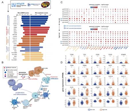CMHR评分基于CD4+ T细胞和CD8+ T细胞的异质性CpG位点构建,而细胞毒性T淋巴细胞(CTL)浸润与抗肿瘤免疫和GBM预后有关。课题组计算了胶质瘤高低风险亚组患者的细胞毒性评分,以分析CMHR评分和CTL的关联,筛选出与GBM和LGG样本总生存期有关的25个基因,被定义为影响胶质瘤患者生存的T细胞浸润和毒性特征基因。这些特征基因参与抗肿瘤免疫和T淋巴细胞毒性功能,在高低风险亚组中表达差异显著。研究发现特征基因与T淋巴细胞相关的异质性CpG位点的甲基化水平相关性更强,CMHR还与胶质瘤的肿瘤微环境变量显著相关。通过ROC曲线分析发现CHMR相比于CTL得分和细胞毒性基因GZMA、PRF1的表达水平,对胶质瘤的生存状态、MGMT启动子状态和IDH状态的预测性能更好。CMHR得分在不同的胶质瘤组织学亚型和MGMT启动子甲基化亚型表现出显著差异,证明了CMHR与肿瘤微环境的细胞毒性T淋巴细胞浸润有关,可作为胶质瘤亚型研究的标志物,表明DNA甲基化异质性可能作为潜在的风险标志物用于监测胶质瘤疾病进展。