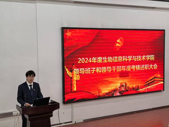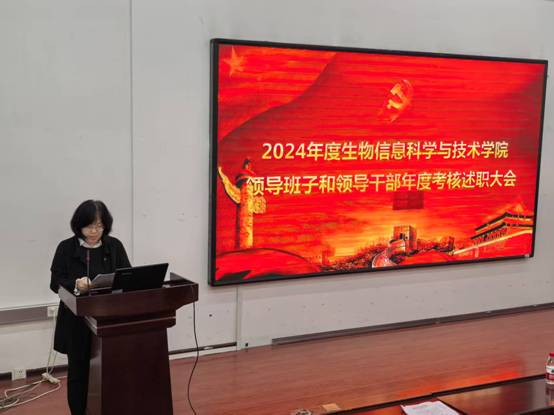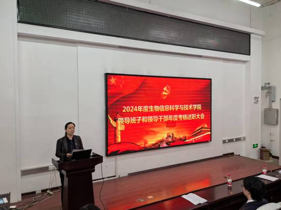 为全面总结2024年度工作,进一步提升学院管理水平和工作效能,生物信息科学与技术学院按照学校党委工作部署于4月11日上午召开生物信息科学与技术学院2024年度领导班子和领导干部年度考核大会。学校党委正处级组织员、组织部副部长周桂琴,考核组成员学校党委组织部党校办公室(教育培训科)主任张婷莅临我院开展考核工作,学院全体教职工到场参会,会议由徐娟院长主持。